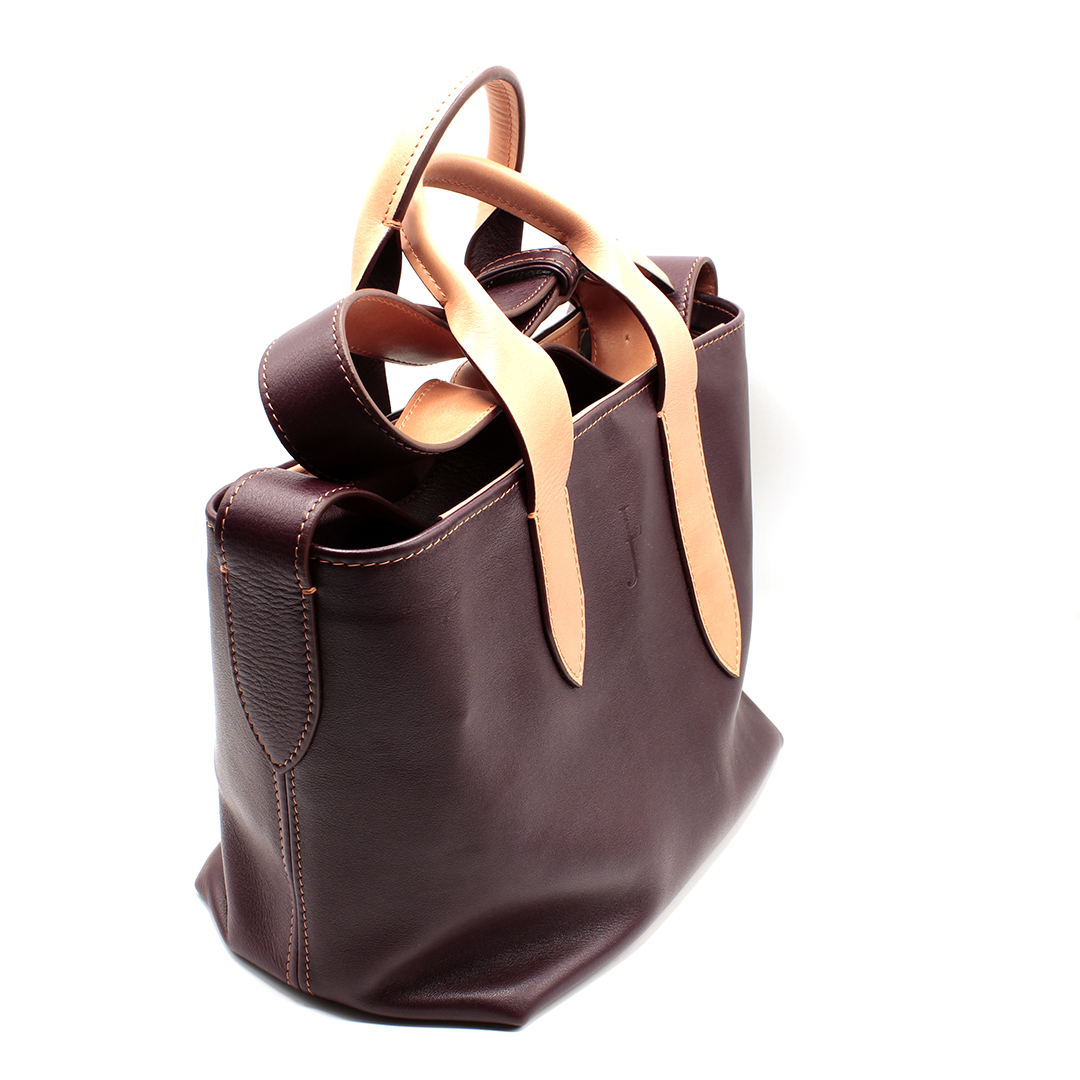 Le Yuni bag en cuir de bovin prune et de veau rose est une pièce unique.