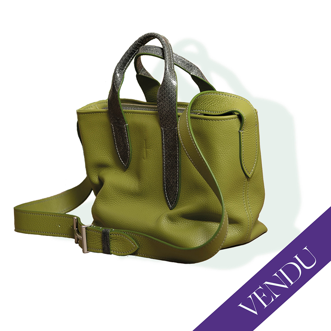 Le Yuni bag en cuir de bovin vert et de saumon gris est une pièce unique.